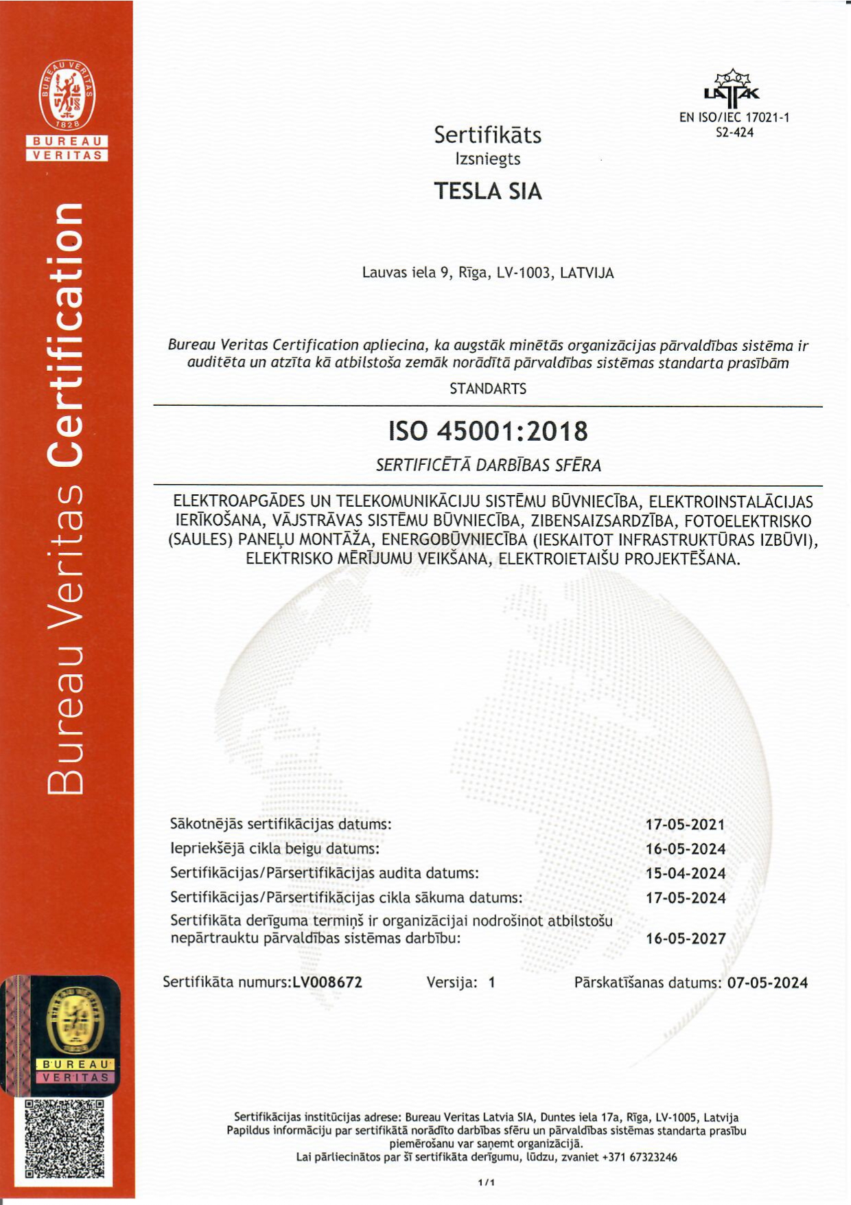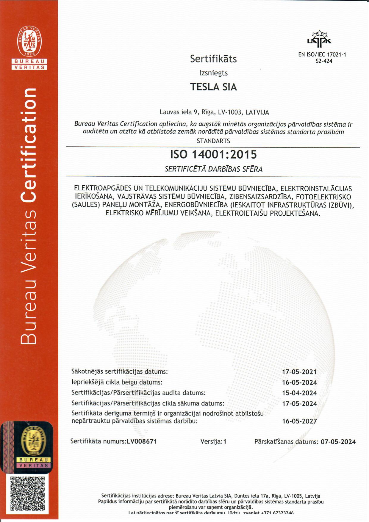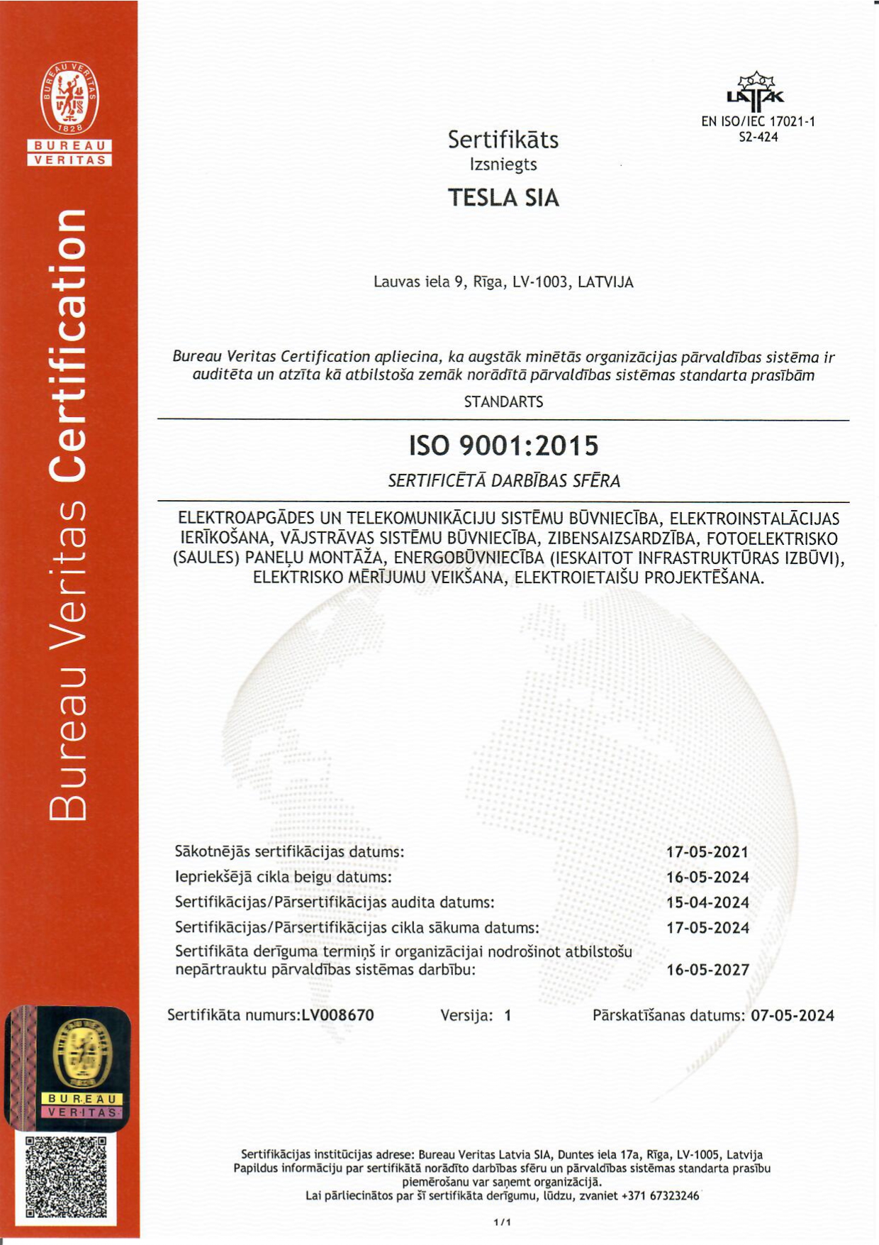 SIA “TESLA”, pildot tam uzticētos elektromontāžas darbus, lielu uzmanību pievērš darba izpildes kvalitātei. Izpildāmajiem darbiem nepieciešamo materiālu iegāde un izgatavošana tiek veikta tikai no sertificētiem piegādātājiem un sertificētās rūpnīcās.