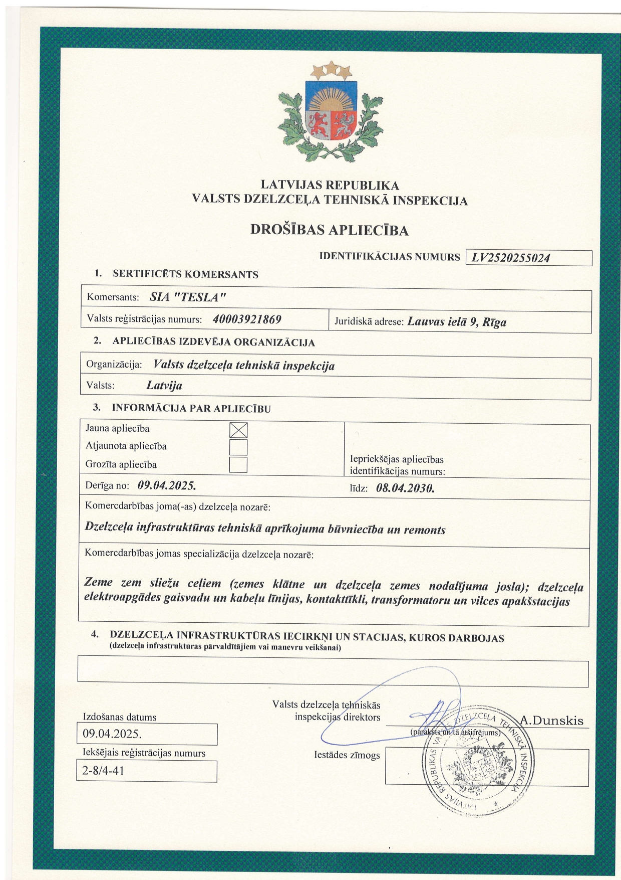 Sertificēts darbu vadītājs, sertificēts būvuzraugs, elektrotehnisko mērījumu sertificēts specialists.